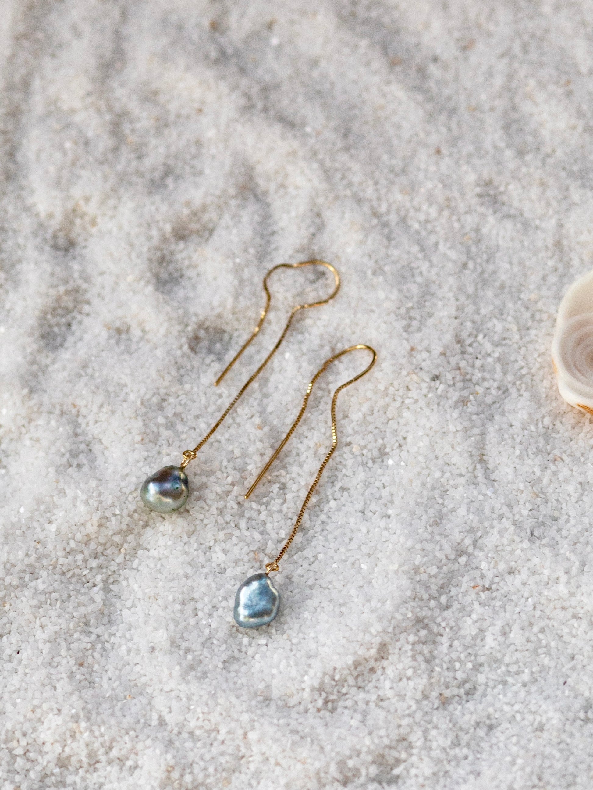 Delicate blue Keshi pearls on gold threads. These elegant, ocean-toned slides add a soft shimmer and tropical sophistication to any look.