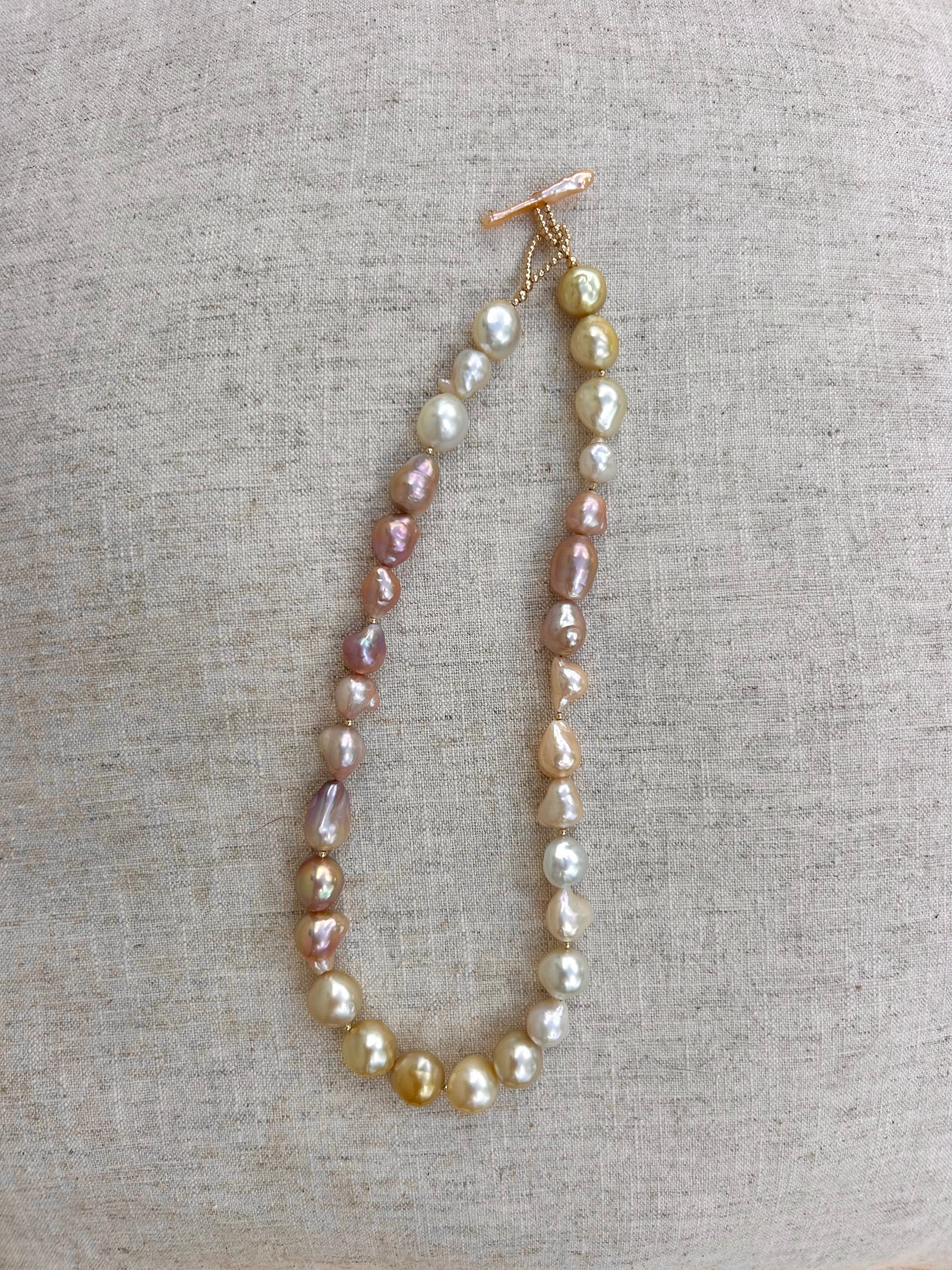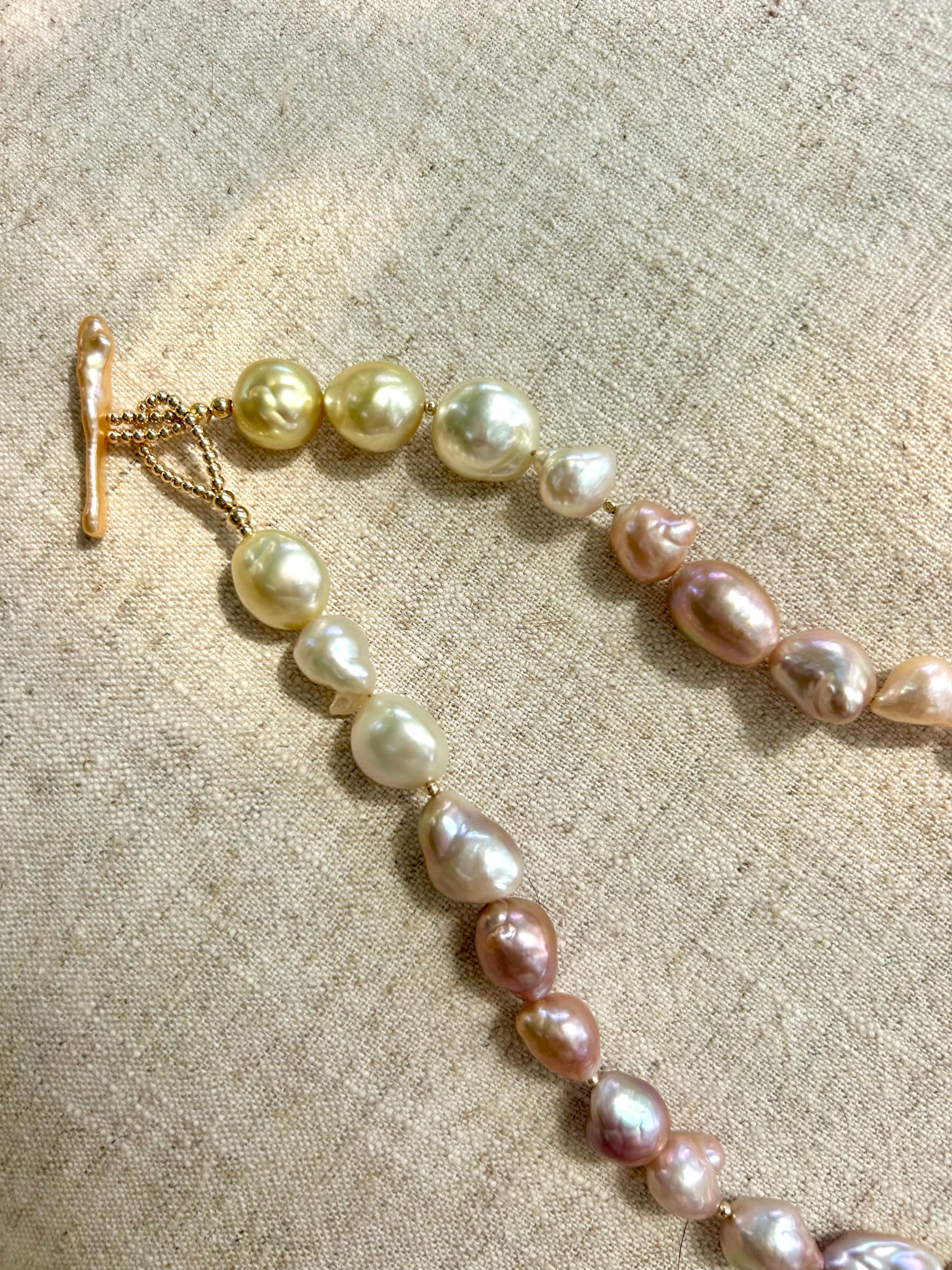 This necklace is very special to my heart. It’s a piece I’ve been quietly designing in my mind for years. A collection of some of my most treasured pearls, each one hand-selected and brought together in an artisan, intentional composition. Golden South Sea pearls melt into soft peachy sunset tones of freshwater pearls before gently returning again, creating an incredibly feminine ombré that feels both natural and luminous. Finished with solid gold detailing and my signature pearl clasp, it’s a piece meant to feel timeless, organic, and deeply feminine.