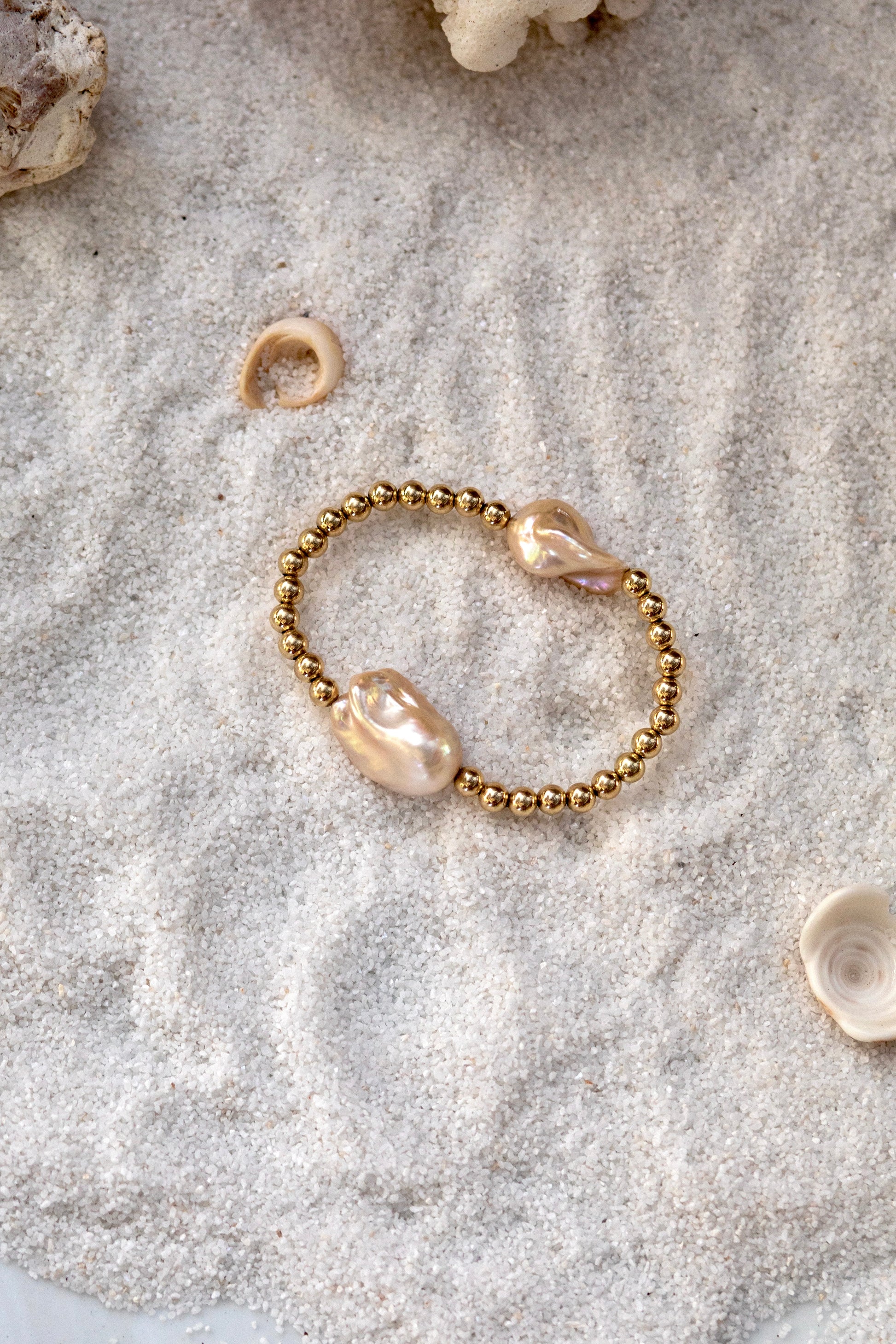 Two large fireball pearls paired with 5mm gold-filled round beads. A statement of natural luxury, balancing organic shape with gleaming gold.